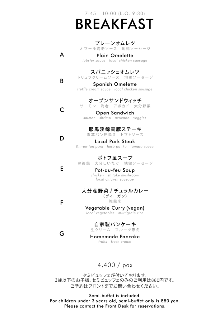 모든 요리는 현지산 고급 생선, 고기, 신선한 야채 등을 다양하게 활용해 준비하며, 각각 재료 본연의 맛을 최대한 살린 우아한 맛을 냅니다. 손님들께 가장 인기가 많은 카푸치노와 함께 즐기는 오이타 표고버섯 감자 포타지나 제철 채소를 곁들인 킨운 돼지고기 키마 카레 등 독특한 요리를 맛볼 수 있습니다.